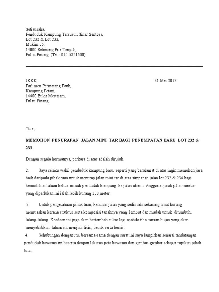 Tuan, memohon penurapan jalan mini tar bagi penempatan baru . Jkkk, parlimen permatang pauh, kampung petani, 14400 bukit mertajam, pulau pinang. Contoh surat rasmi permohonan jalan tar surasmi x. Ketua kampung jalan contoh surat rasmi sokongan naik pangkat contoh .
